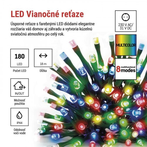 LED vianočná reťaz, 18 m, vonkajšia aj vnútorná, multicolor, programy, časovač