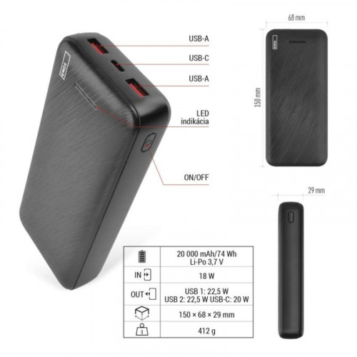 Power bank EMOS AlphaQ3, 20 000 mAh, 22,5 W, čierny